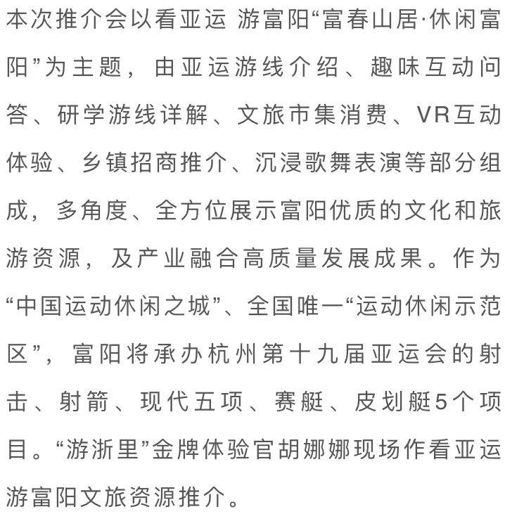 近年来,富阳抢抓亚运契机,提出“开拓体旅融合新境界,打造富春山居运动休闲典范地”,全面打响“亚运富阳、赛会富阳、水上富阳、飞翔富阳、山地富阳”运动休闲名片,重塑“中国运动休闲之城”品牌。今年4月,为添彩亚运,富阳发布十大亚运观光主题游推荐路线,涵盖古道寻幽、宋韵迹忆、乡野美食、运动休闲、非遗体验、艺术乡建等多个类目,旨在通过线路发布,充分展现富阳区的独特魅力和丰富旅游资源,引领亚运观光旅游新风尚。