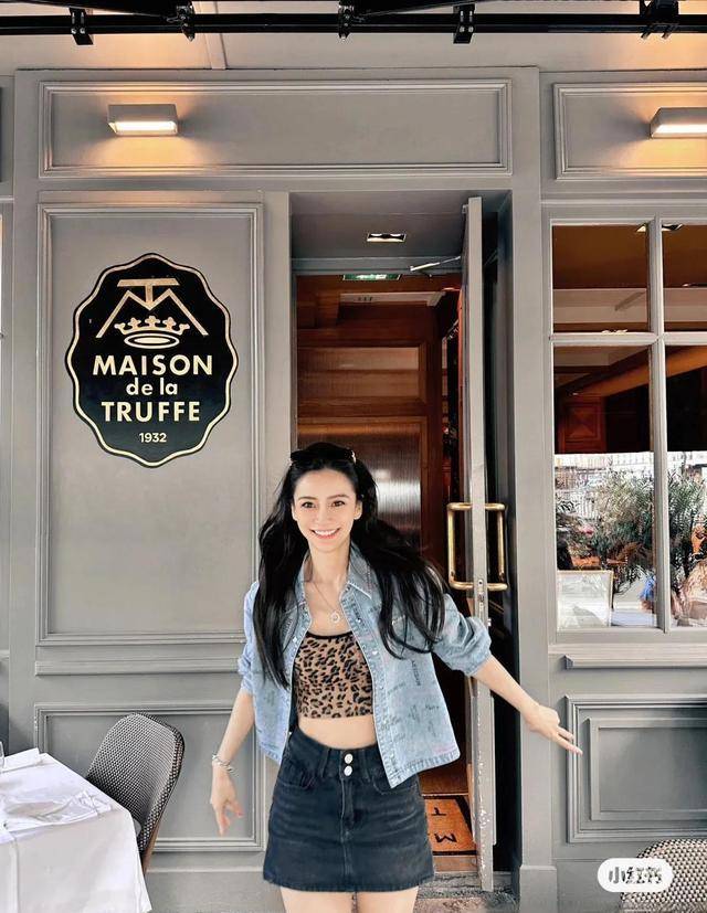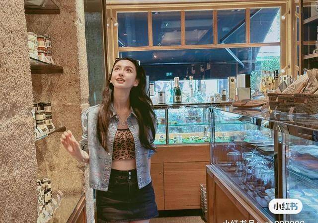 图中,angelababy还是标识性的一头黑色卷发,身穿淡蓝色牛仔衣和黑色牛仔短裙,里面搭配了一件小背心!大方露出小蛮腰和大长腿!angelababy笑容满面的样子!看来心情非常不错!