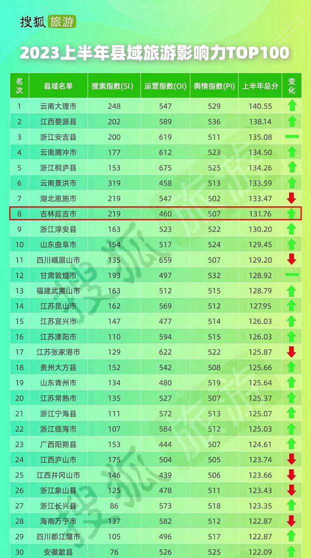 近日,搜狐旅游发布了2023上半年全国县域旅游影响力TOP100,这是一份及时反映各地旅游影响力的“线上成绩单”,吉林延吉跻身前十。