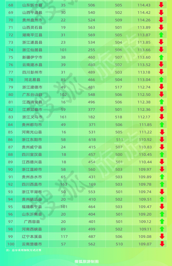 据悉,搜狐旅游以《中国县域旅游竞争力报告》为蓝本,创建县域旅游影响力指数动态测评体系,按季度发布县域游传播影响力报告,综合了2023年前6个月各县域每季度的品牌传播运营网络搜索和口碑舆情指数,汇总呈现2023年上半年全国县域旅游影响力百强榜单。