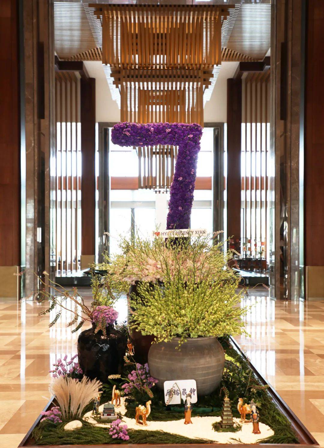 活动期间,酒店大堂呈现出七周年主题装饰,在鲜花簇拥下,将酒店周边的名胜古迹徐徐展开,突出了酒店持续与本土文化结合,为宾客展现西安古城魅力。
