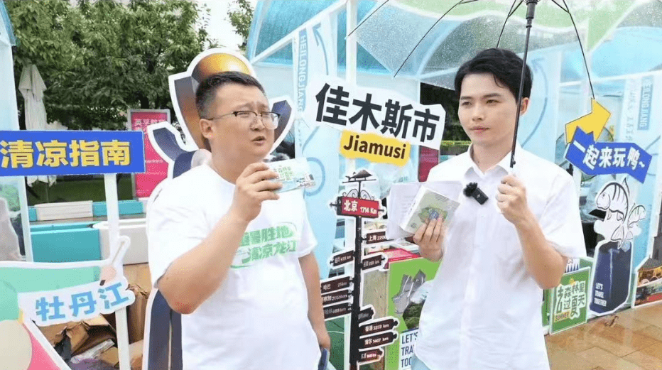 活动现场还通过省文旅厅官方抖音、携程网、网红大v推介官等媒体平台现场直播,市文旅集团副总经理刘凯重点推介了佳木斯市的“华夏东极游、现代农业游、朝族赫乡民俗游、三江平原湿地生态游、红色印记游”等五条精品旅游线路,介绍了黑瞎子岛旅游区、同江街津口赫哲文化村、富锦国家湿地公园、桦川县新中国第一集体农庄星火旅游区、汤原大亮子河森林公园、桦南百年蒸汽火车旅游区等旅游景区,这些线路不仅蕴含着丰富的自然风光,也可以感受到佳木斯市的人文和历史。他特别推荐喜欢自驾游的朋友一定要来醉美331国道,从华夏东极抚远到三江口,3个小时左右的车程,可以途径森林、湿地、平原,感受黑龙江、松花江两江交汇而不相融的神奇景象,一路美景不断。最特别的是,沿途还会经过一段特色音乐公路,当车辆行驶在这段路上时,通过轮胎与地面摩擦声音的变化,听到《乌苏里船歌》那熟悉的旋律。同时,他还介绍了佳木斯地方特产“佳木斯大米”和市博物馆的文创产品。