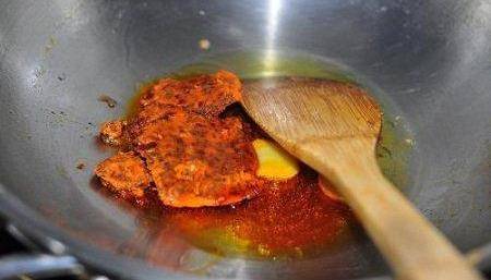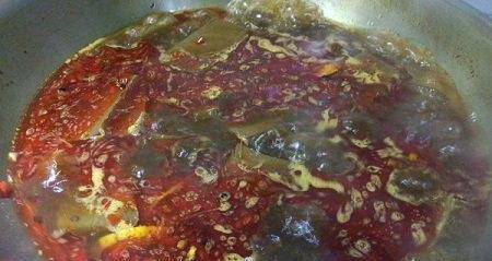 将火锅底料炒融化之后倒入清水煮沸,这里倒入的清水最好是热水,容易煮沸一些