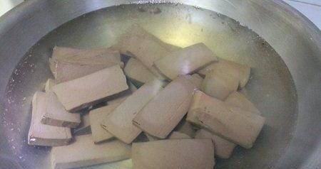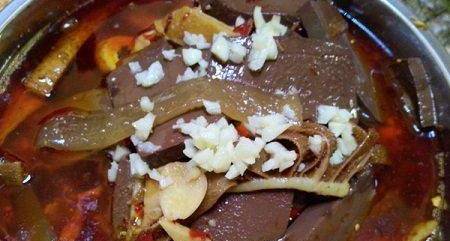 再将鸭血也放入锅中,当鸭血外表微微发白之后,即可捞起备用