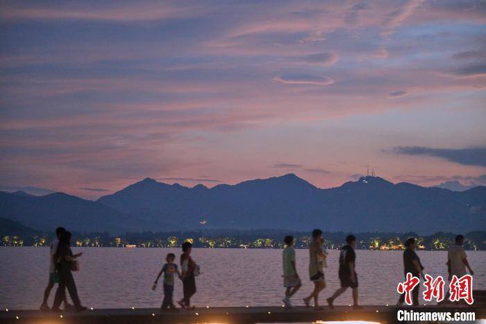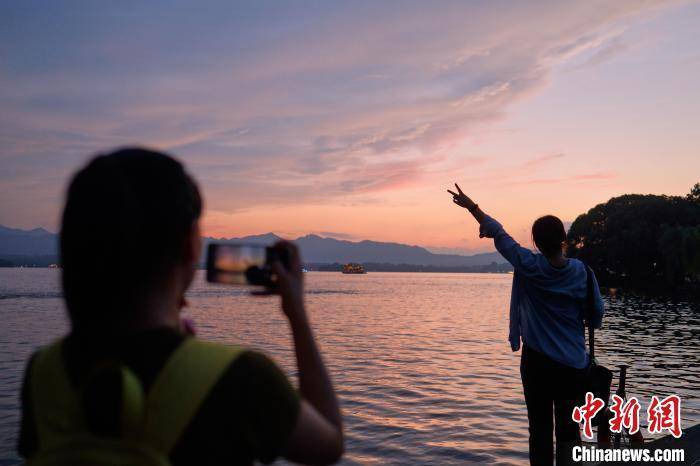 近日,随着浙江杭州梅雨将歇、高温临近,杭州西湖在日落时分呈现壮美晚霞,令人流连。