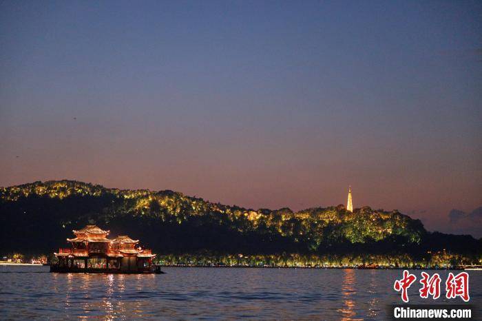 图为落日时分西湖宝石山灯光亮起。 徐梓齐 摄