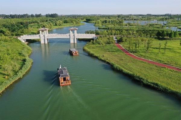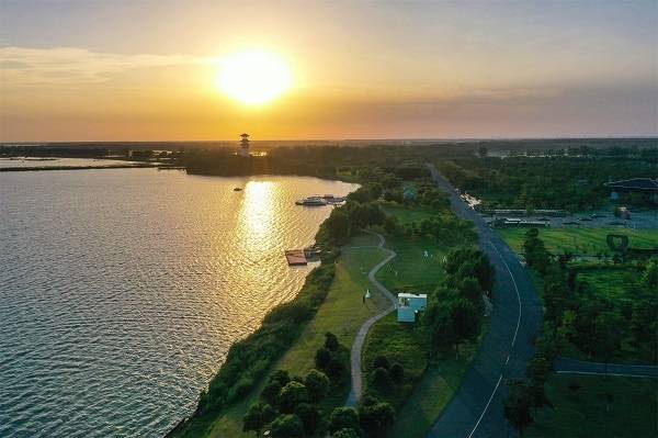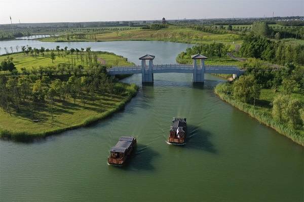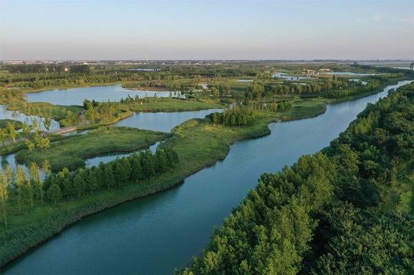 7月5日,在江苏省宿迁市泗阳县成子湖旅游度假区内,湖岸沿线绿植密布,一幅水美景秀的生态画卷徐徐展开,吸引众多游客前来游玩。