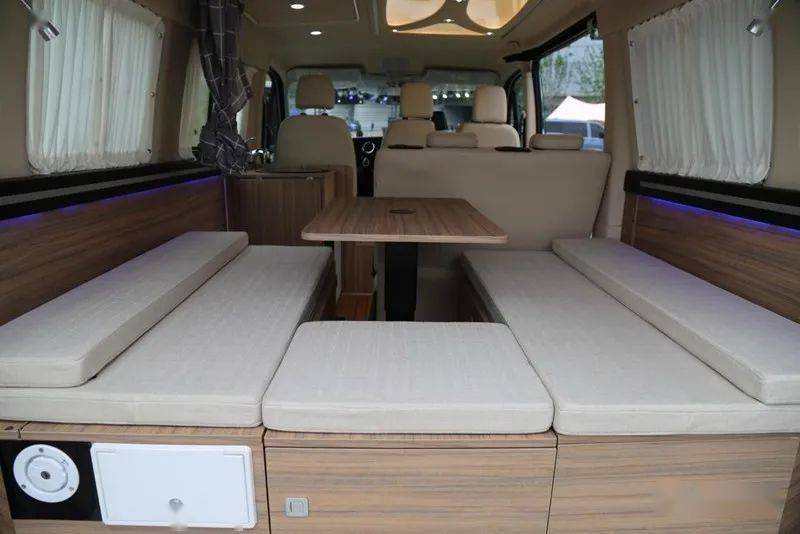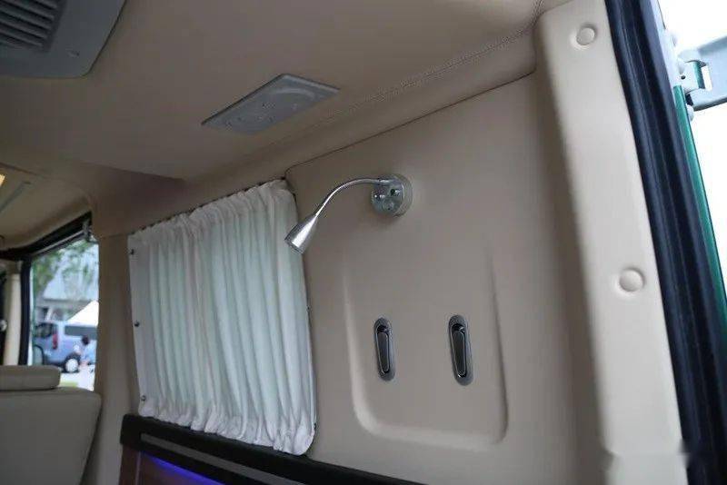 车内灯光氛围不错,四周的窗户都配有窗帘,最大限度的保护成员隐私,颜色较深的是防水浴帘。