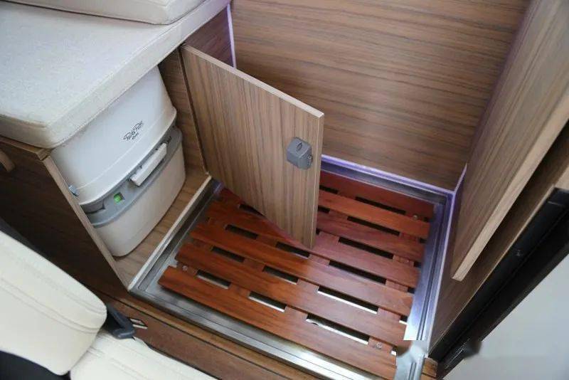 比较厉害的是洗手池旁边是用来临时洗浴的场所,下方区域有排水的功能。拉上上方的浴帘,就可以形成一个临时的干湿分离区。同时,这个区域也可用来上厕所,打开旁边的收纳柜,就可以看到便携马桶。