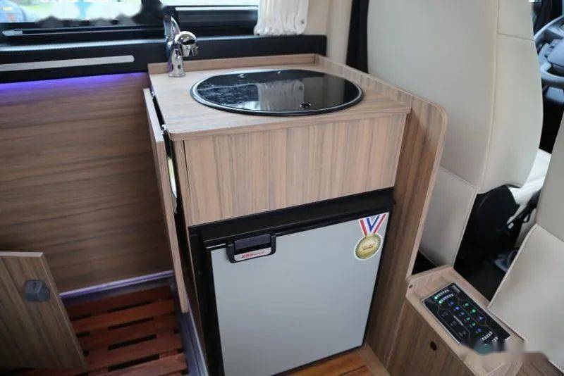 角落上的洗手池,不用时可以盖好,右侧是折叠桌板,下面是英德尔65L车载冰箱。