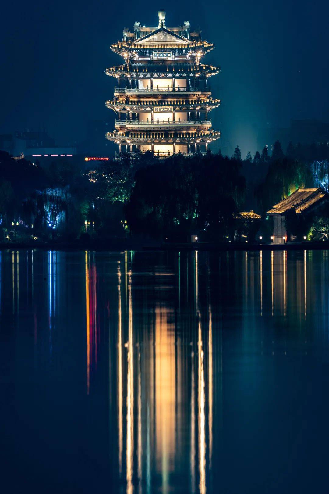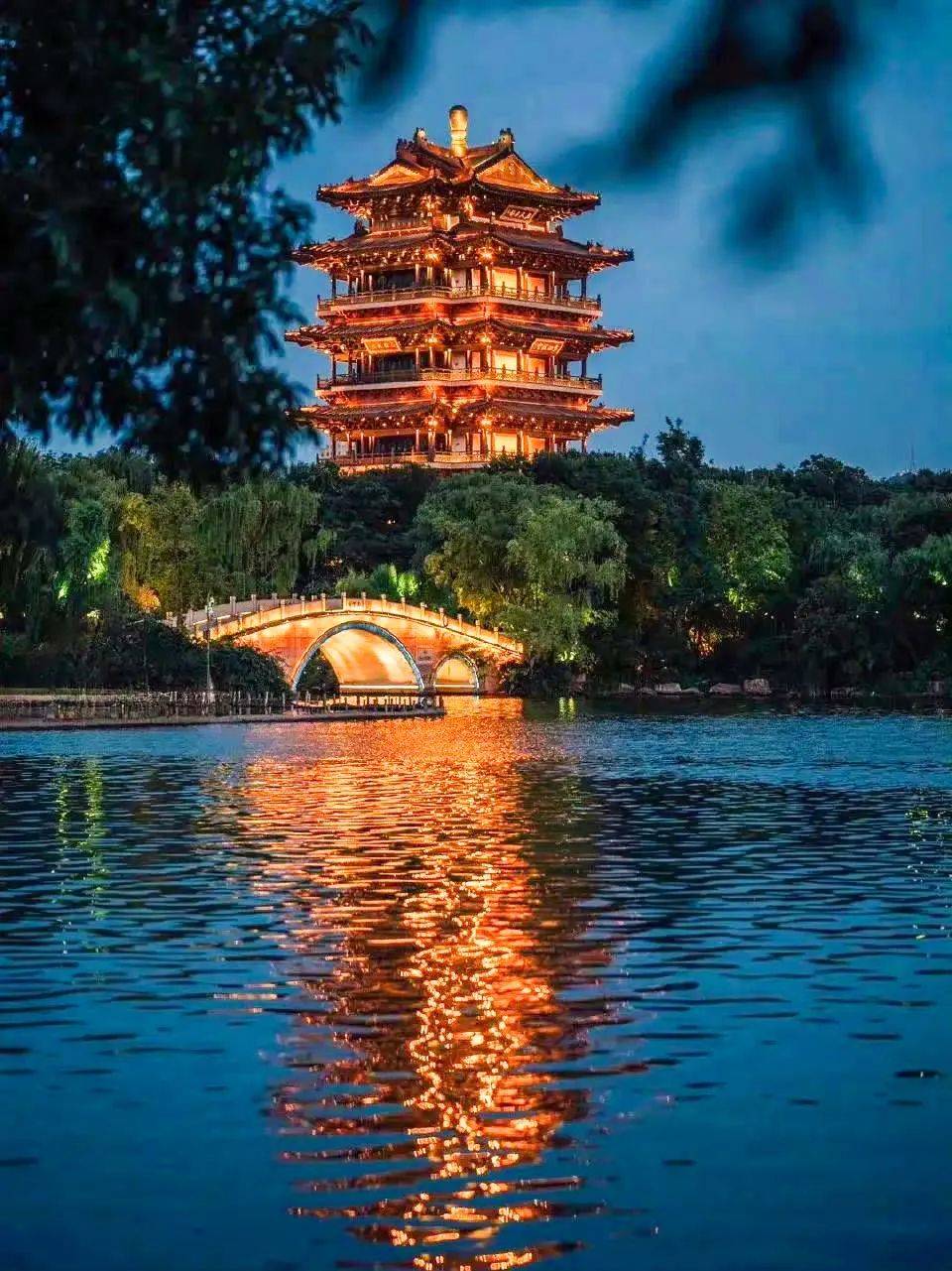 顺着桥上的明灯到湖心历下亭,红的廊柱、绿的垂柳、褐的匾额、青的瓦片都被灯光贴上一层流光溢彩的膜。月夜下的明湖收起内敛,以舒展的姿态肆意展示藏不住的美。