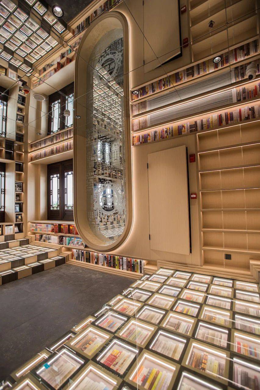 顺着片片瓦当的指引向里走,中式楼台混搭西式露台,U型书架与镜面棚顶搭配,让这里有种现代版“藏经阁”的幽静深邃之感。