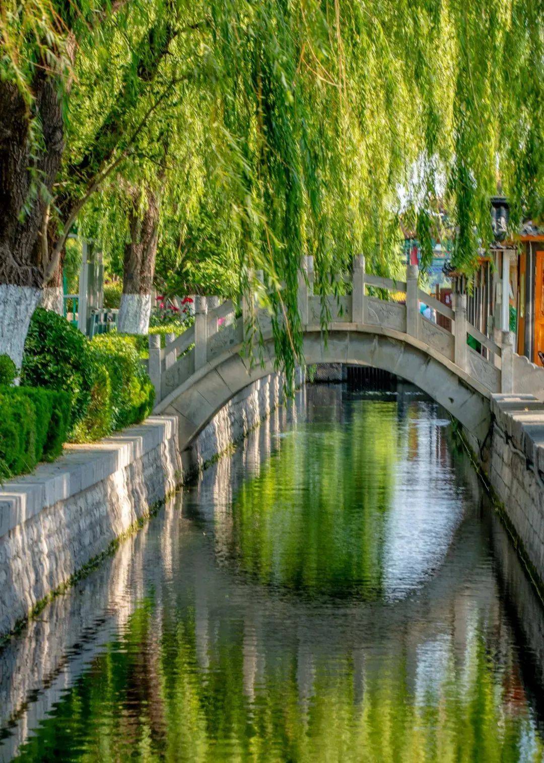 于湖畔观望,坡绿滩翠、柳黄桃红、有洞庭之浩瀚、西湖之俏丽总揽其中。漫步于湖畔,水泽清澈碧绿,空气中飘散着花草香气,垂柳倒映在湖中,连带着颠倒的赵州桥、玉皇阁构成了一幅秀美的画卷。