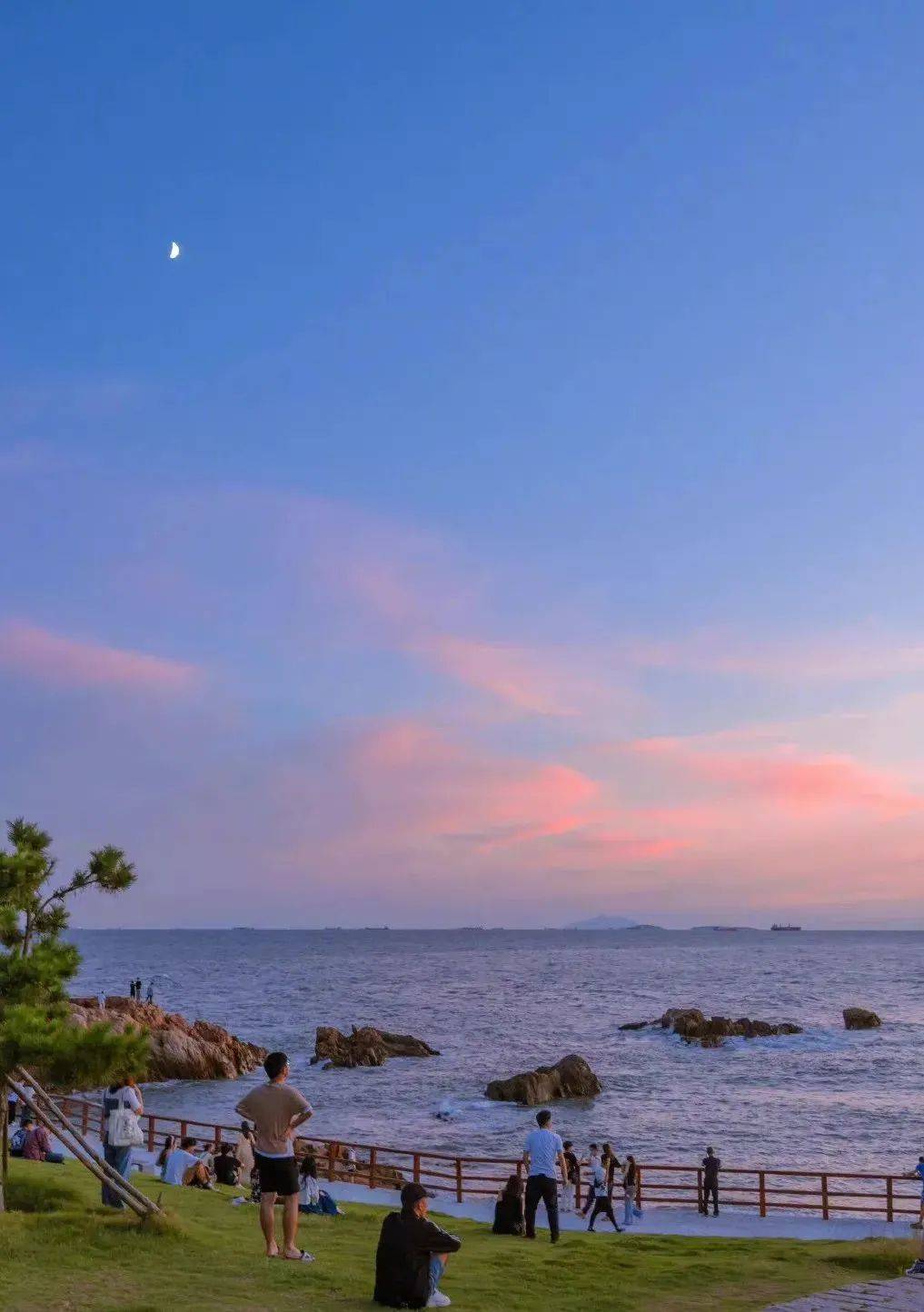潮起时浪花轻轻拍打礁石,带着凉意的海风扑面而来,席地坐在绿油油草坪上,戴上耳机,微闭双眼,静悄悄神游一会,在享受风景的同时,也成为别人眼中的风景。