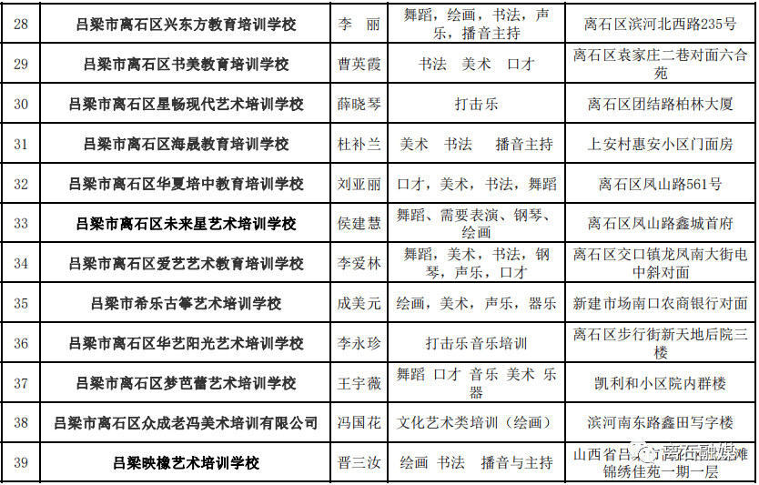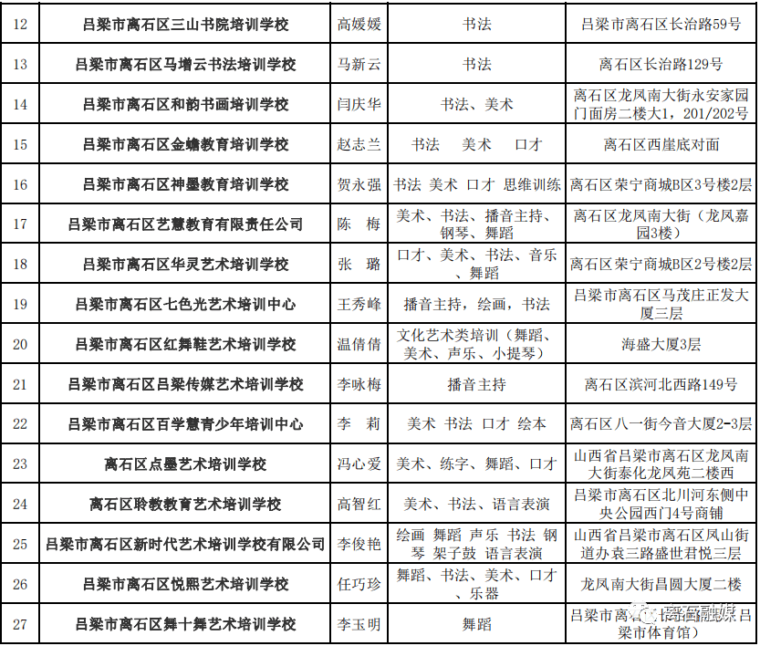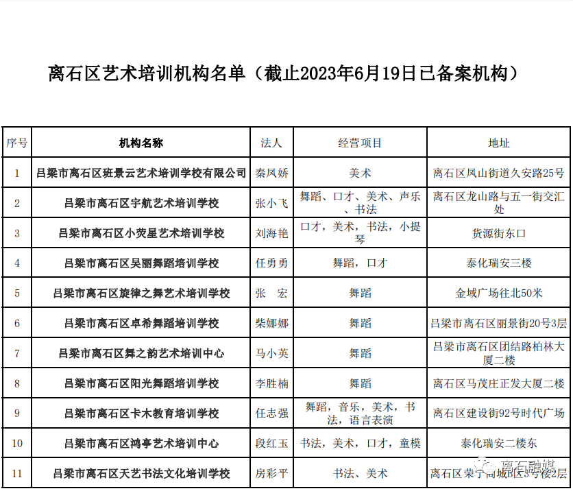 附件:《离石区取得办学许可证的文化艺术类培训机构名单》(截至2023年6月19日已备案机构,如有新备案机构将及时动态更新)