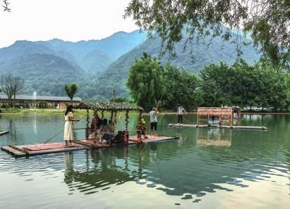 彭州海窝子古镇,花船竹筏水中游。摄影王树琼