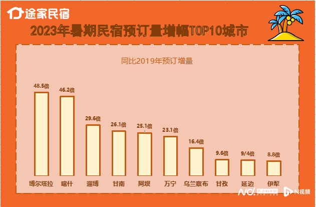 除了去海滨城市避暑外,不少用户打开思路,选择到新疆、甘肃等地清凉游,多个西北城市成为暑期民宿预订游黑马,预订量攀升最快。如赛里木湖所在地博尔塔拉、异域风情的古城喀什,预订量同比2019年增长40倍以上;绝美秘境甘南、阿坝预订量同比增长超25倍。值得一提的是,不少人选择暑期错峰进“进淄赶烤”,淄博民宿预订量增速排名全国第三,有望延续五一的火热态势。