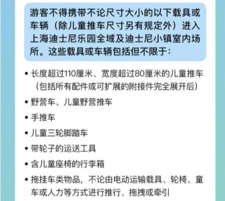6月30日,上海迪士尼度假区发布新规,游客不得携带不论尺寸大小的以下载具或车辆 (除儿童推车尺寸另有规定外) 进入上海迪士尼乐园全域及迪士尼小镇室内场所。