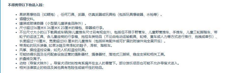 游客可携带符合以下所有规定的儿童推车:长度不超过110厘米、宽度不超过80厘米(包括所有配件或可扩展的附接件完全展开后);且为11岁及以下或身高在1.4米及以下的儿童设计并在游园当天供此年龄段或身高段的儿童乘坐的儿童推车(以游园当日的年龄及身高为准);并仅可从后方推行。