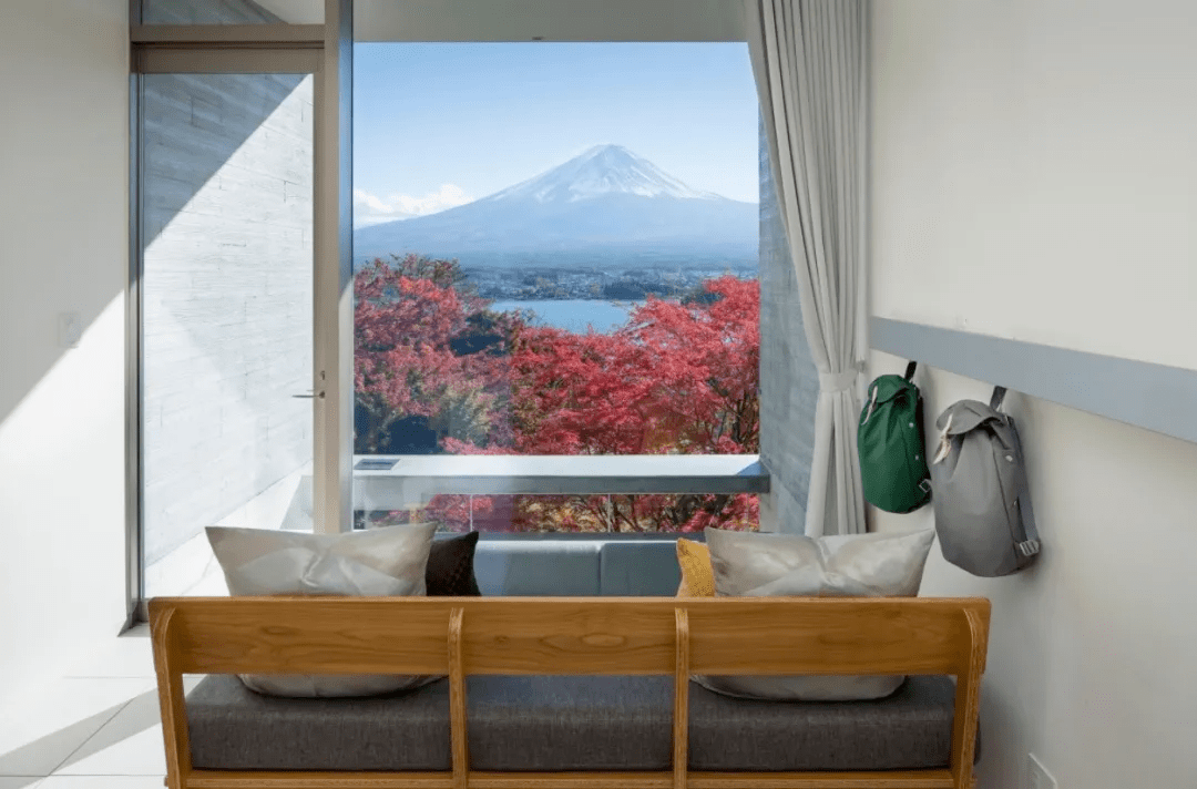 静谧的富士山脚下坐落着虹夕诺雅富士酒店。透过卧室的大落地窗,对岸的富士山映入眼帘。春天,樱花飘落,满目的白粉色为富士山填充了些许俏丽;入秋后,枫叶染上了温润而又热烈的红色,落在石阶组成的小路上,漫步在酒店周围人们可以很清晰地从脚下听到属于秋天的声音。
