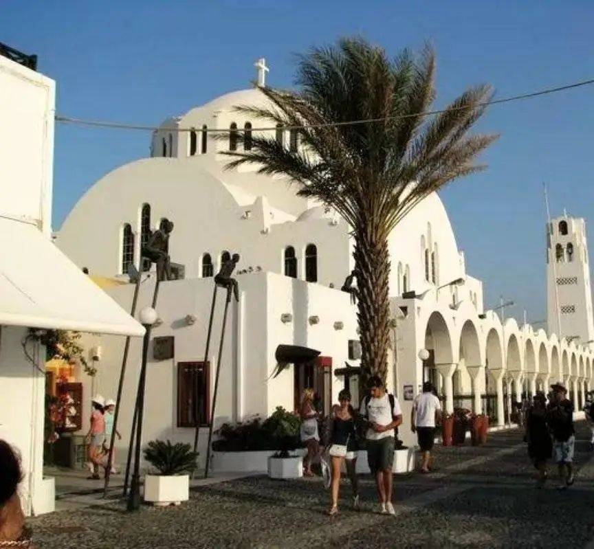 圣托里尼岛的首府费拉镇,坐落在距离火山口最近的悬崖顶端。作为圣托里尼的商业中心和旅游中心,费拉有各种商店和餐馆,窄窄的步行街迷宫一般。