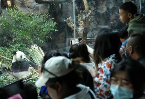 4月30日,游客在北京动物园大熊猫馆观赏大熊猫“萌兰”吃竹笋。