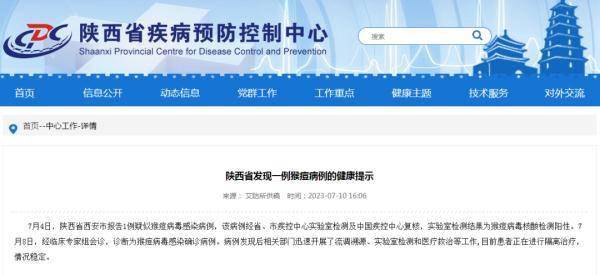7月4日,陕西省西安市报告1例疑似猴痘病毒感染病例,该病例经省、市疾控中心实验室检测及中国疾控中心复核,实验室检测结果为猴痘病毒核酸检测阳性。7月8日,经临床专家组会诊,诊断为猴痘病毒感染确诊病例。病例发现后相关部门迅速开展了流调溯源、实验室检测和医疗救治等工作,目前患者正在进行隔离治疗,情况稳定。