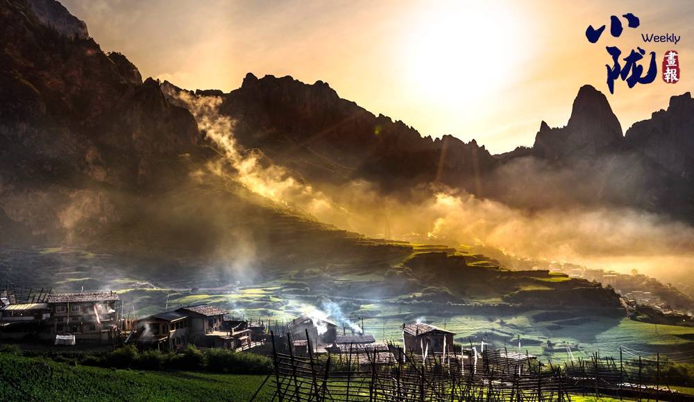 原生态的榻板房依山而建,从低至高的错错落有致。金色的日光透过云层给屋顶镀上一层温暖明亮的色彩。