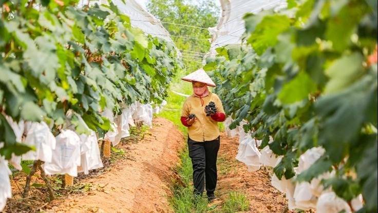 人民网南宁7月10日电 盛夏时节,走进广西南宁市兴宁区三姐故事周末生活文化园,一片景美人和的田园风光展现在眼前,一串串星海般璀璨的紫黑葡萄挂在藤蔓上,等待人们采摘。