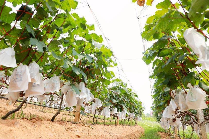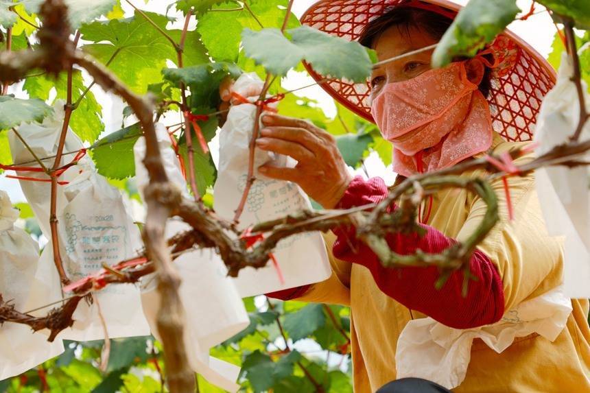 工作人员给巨峰葡萄套上防虫袋。黄小倩 摄