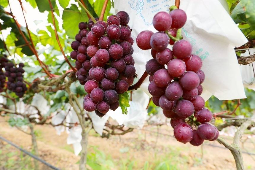 一串串紫黑色的巨峰葡萄挂满枝头,光泽诱人,粒粒饱满,颗颗甜蜜,多肉少籽,在阳光的照耀下犹如玛瑙般晶莹剔透,散发着醉人的清香。而一些还套着防虫袋的巨峰葡萄,也正在等待采摘工人的“检验”,保证每一串的品质,“因为这个葡萄很甜,会吸引各种虫、鸟,套上这些防虫袋主要是保证葡萄果肉的完整,防止被鸟、虫吃掉。”工作人员介绍。