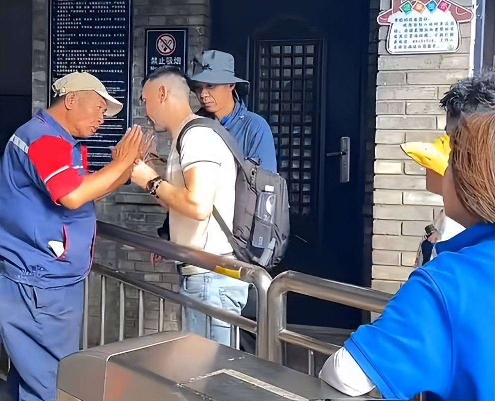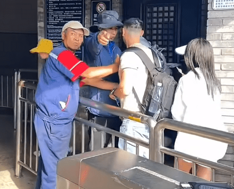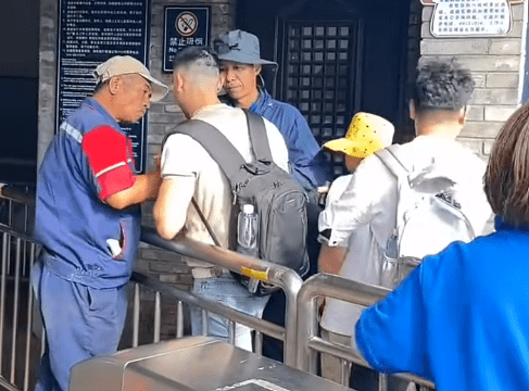 事情发生的起因是,一名穿着衬衫背着旅行包的外国男子被景区的工作人员拦在门外,他几次想闯进去,但是工作人员都没让他进去。
