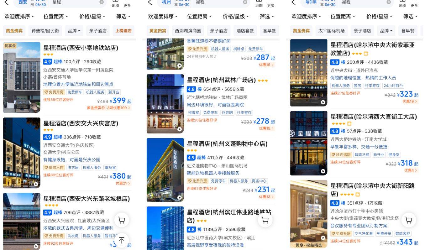 打开某OTA平台搜索星程酒店,列表上出现从上到下排列的星程酒店门店信息,映入眼帘的提示语是“连续28位住客好评”“连续25位住客好评”“连续33位住客好评”“连续61位住客好评”“连续21位住客好评”“连续47位住客好评”……