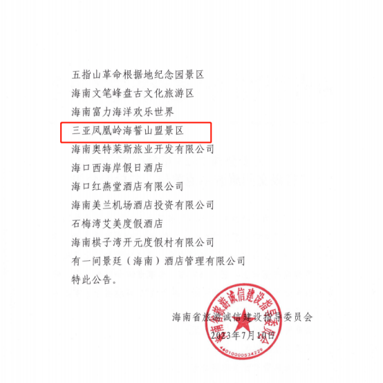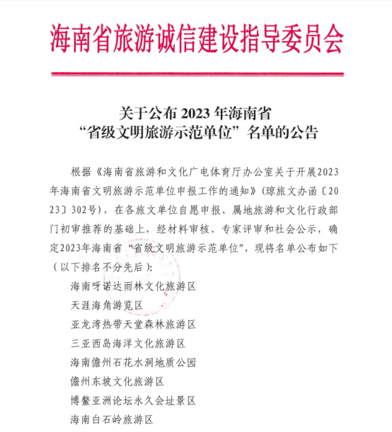 7月10日,2023年海南省“省级文明旅游示范单位”名单公布。三亚凤凰岭海誓山盟景区、海南呀诺达雨林文化旅游区、天涯海角游览区等19家旅文单位获评“省级文明旅游示范单位”荣誉。
