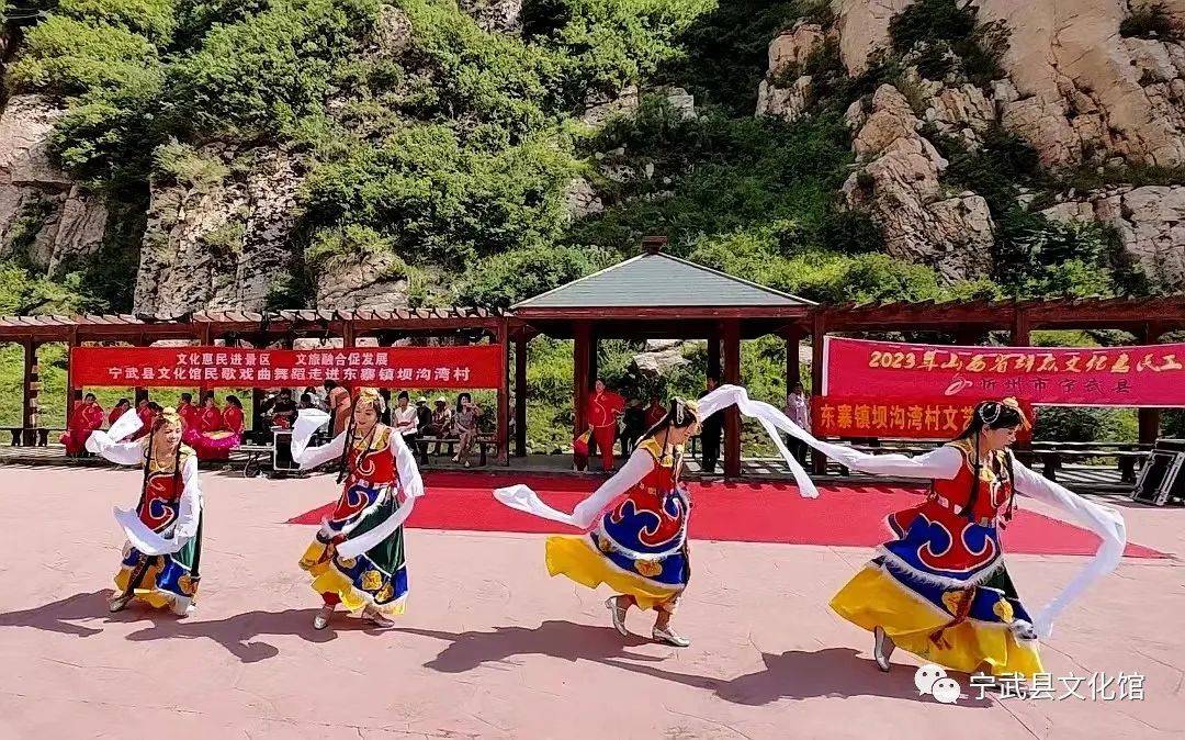 演出在旋律优美的歌曲《美丽家园》中正式拉开了帷幕,宁武县心连心民族舞蹈队、佳音合唱团以及县戏曲家协会组成的演出团队以民歌、戏曲、舞蹈等表演形式,为东寨镇坝沟湾村当地群众和过往的游客献上了一场精彩的文化艺术盛宴。