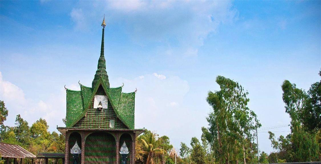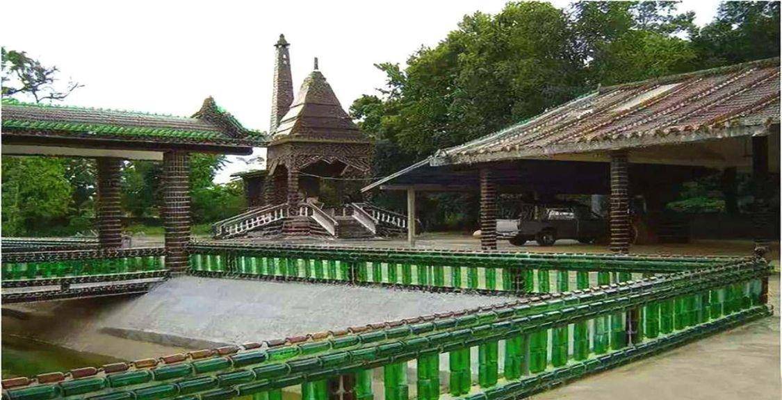 这座寺庙便是“百万瓶寺”,百万瓶寺,一座位于国外和柬埔寨边界的寺庙里的僧侣历时20余年,用上百万个玻璃啤酒瓶建起了他们的庙宇,共建20座房屋。为了建造这座寺庙,这里的僧侣花了20多年,用了150万个旧啤酒瓶。如今这里被称为“百万瓶寺”。