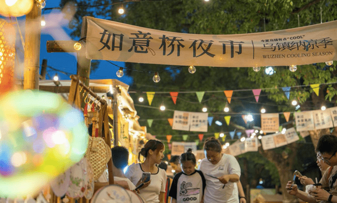 除了可以纳凉吃饭,乌镇冰室、童趣空间、如意桥夜市等夏日限定活动为游人的夜生活增添色彩。手持团扇的货郎走街串巷与游客互动,沿街叫卖花环、古风团扇等夏季好物,游客可在如意桥夜市摊位上选购琳琅满目的文创产品、国风饰品、新中式服饰等。
