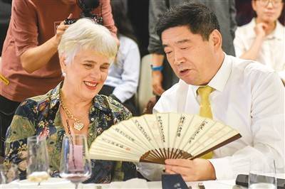 浙江“宁波文博奇妙夜”启动仪式活动现场,中外嘉宾欣赏中国纸扇上的篆刻书法艺术。