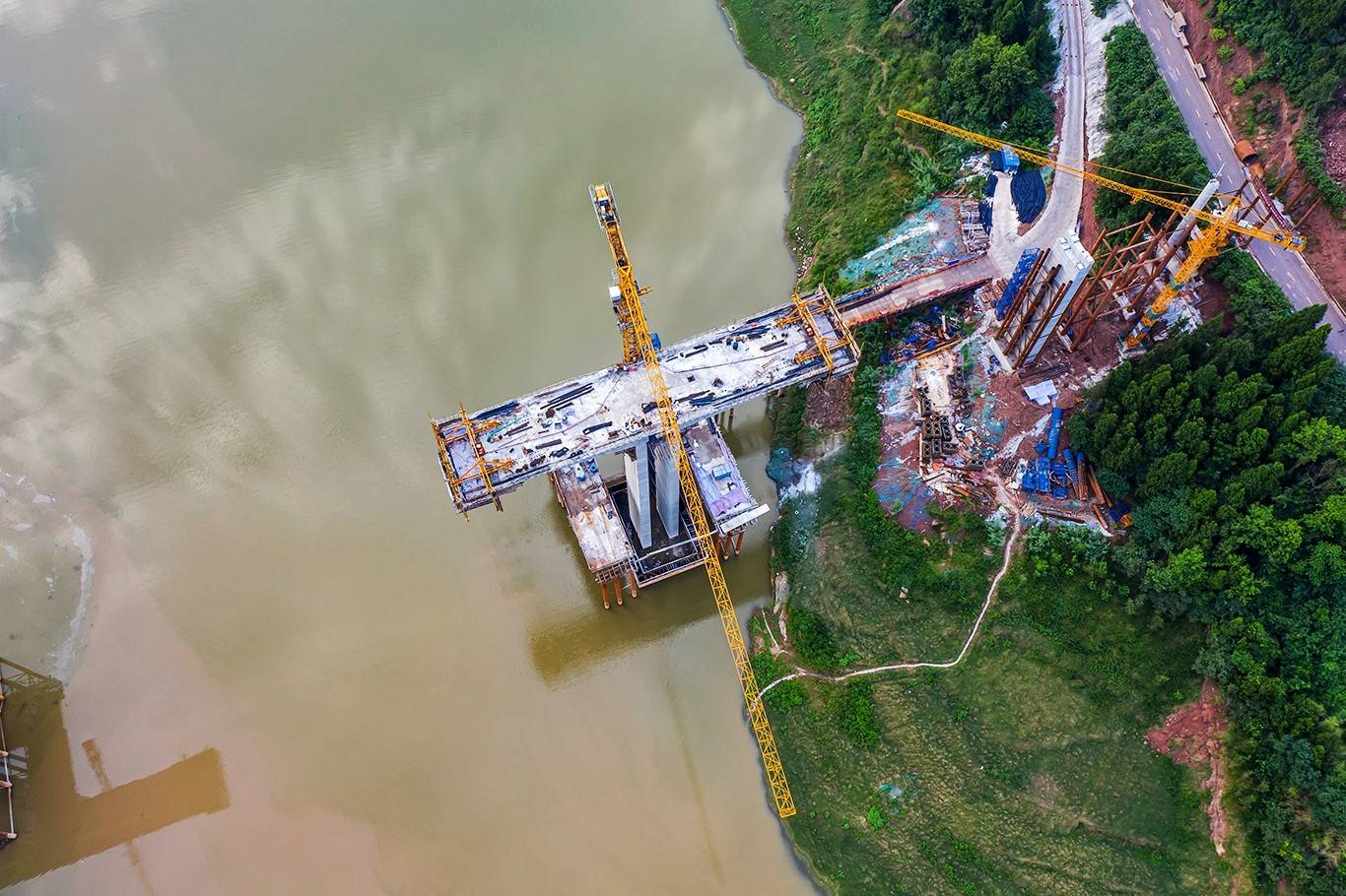 7月8日,从空中俯瞰忠县县城至石宝寨沿江旅游公路,建设中的兰家山大桥宏伟壮观。