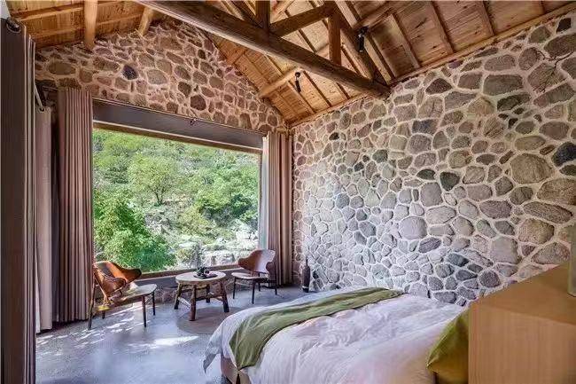 花筑富泉山居位于平邑县柏林镇境内的蒙山民宿集聚区,从环境营造、内部设施、功能配备、文化特色等方面被评为五星级民宿。应季的水果让入驻的客人感受到沂蒙人的热情好客;为客人搬运行李,则尽显服务周到。“当地民宿极具山区特色,注重文化内涵,规划合理,服务贴心,让人住得舒坦、放松”就是民宿打造的原则和目标,大部分服务人员也都是当地村民。