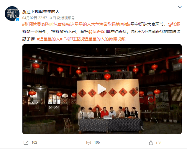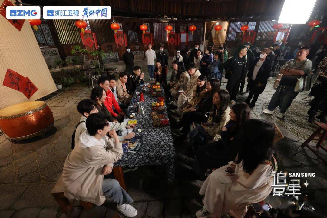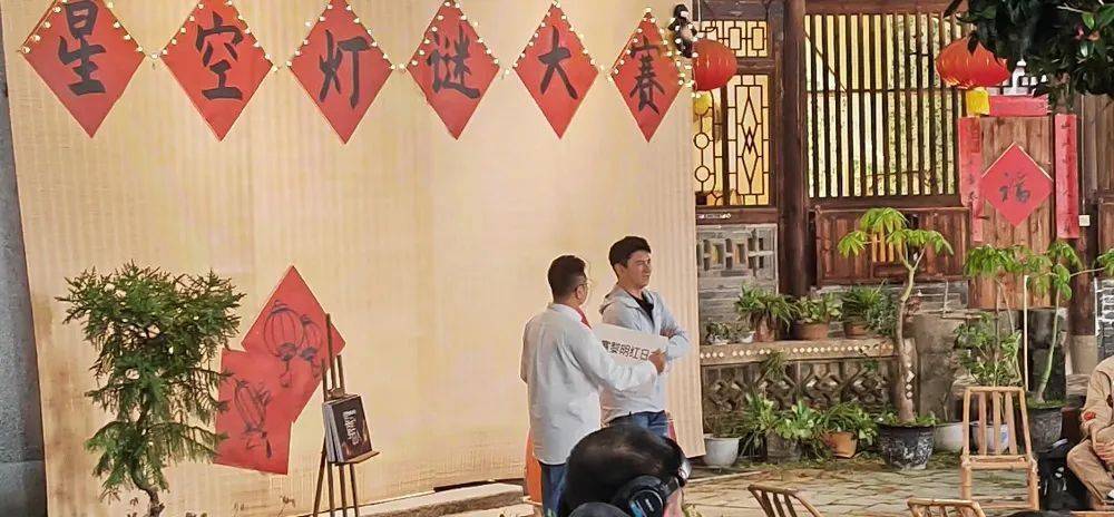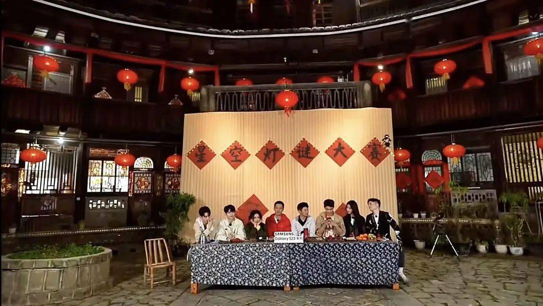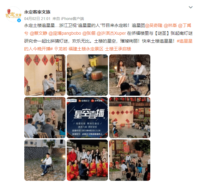 浙江卫视的《追星星的人》节目组带着“追星团”吴奇隆、林峯、丁禹兮、蔡文静、庞博、张俪、许淇杰在永定侨福楼里比拼猜灯谜,场面甚是欢乐。