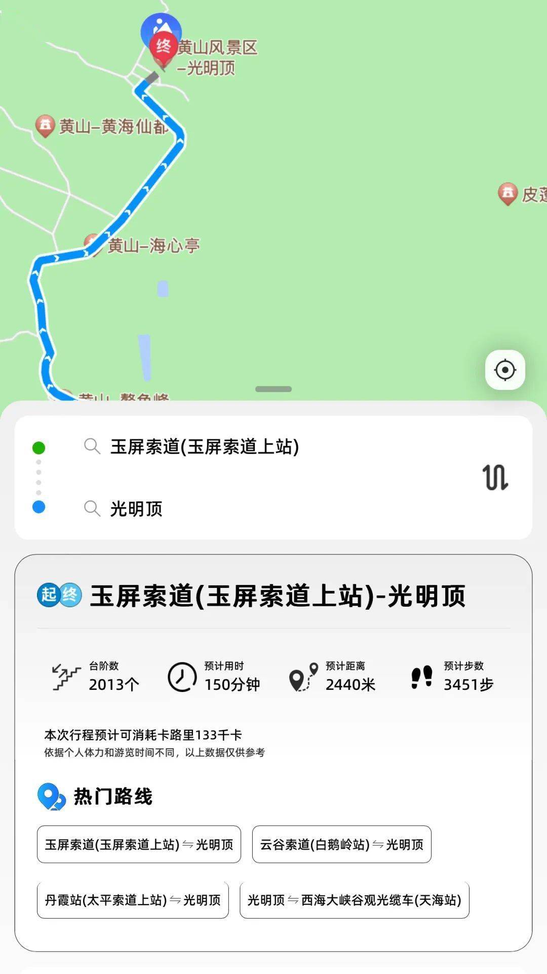 黄山风景区面积160.6平方公里,非常的大,景区内没有定位导航,大家游玩都是依靠一张地图和山上的指示牌来判断线路和方向。山上常见的打招呼方式就是,迎面而来的人互问,去到哪里哪里还要走多久?尤其是初来黄山的游客,对于游玩时间和线路距离没有很强的感知。新上线的景区导览功能解决游客这个需求,景区核心线路点到点的距离和用时可以在线实时查询,更是细节到台阶数、用时、距离、步数和消耗卡路里。这一新功能帮助游客很好的规划游玩时间和线路。