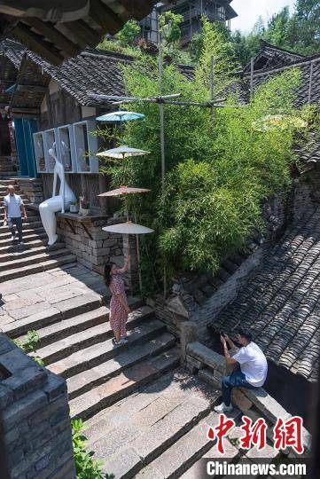 游客在贵州省遵义市播州区乌江寨景区拍照留念。 宋朝晖 摄