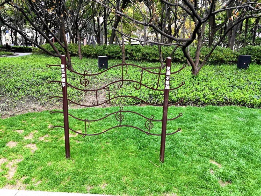 便民衣帽架为挂置衣物提供方便的同时,采用了五线谱与音符的造型,既实用又美观大方。主体的棕色与周围的自然环境融为一体,高音谱号、八分音符等钩子的设计又与东北方向的衡复音乐街区遥相呼应。