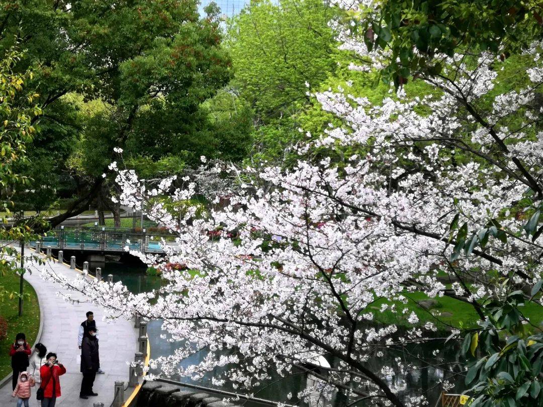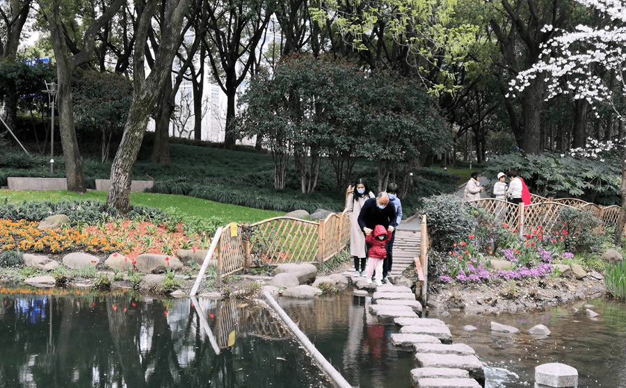 另一边,长辈拉着孩子的手,一步一步踩着石板走过流淌着的小溪,年轻的、鲜艳的红色为整座公园再添生机;更多的,还是三两游人经过,停下脚步举起手机,拍摄下心中满意的春景。