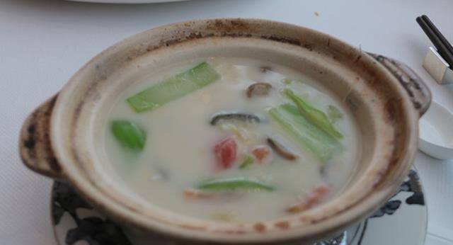这道龙虾是用了两斤多的,美国红龙。这道菜在香港的朗廷酒店一共做了38年,是现任中餐厅主厨的招牌菜获奖无数,入口时有一股酱香的味道。,龙虾肉很有弹性,肉里并没有酱汁的味道,保留了原始龙虾味,但是壳上面有一些焦味儿,香香的非常不错。还有就是锦绣鱼汤鲜斑球,这道菜是石斑鱼做的,用时蔬垫底,味道鲜美,有一点点辣味儿,但是辣味儿咽下去以后就消失了,有一种入口即化的感觉,不知道是怎么搞的。
