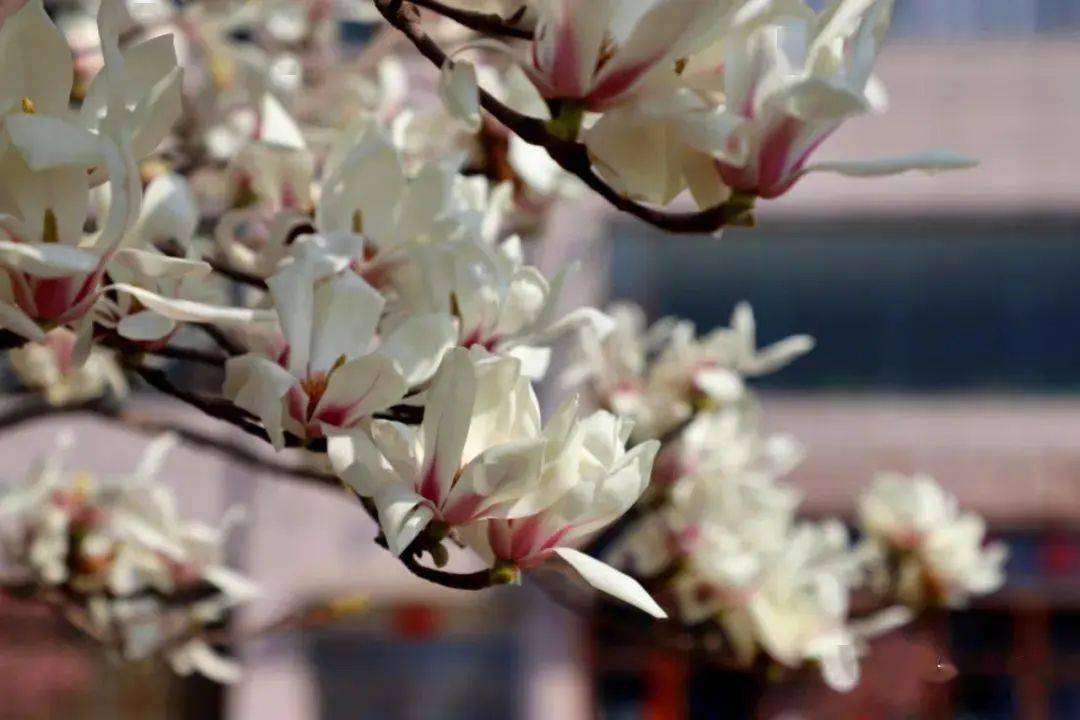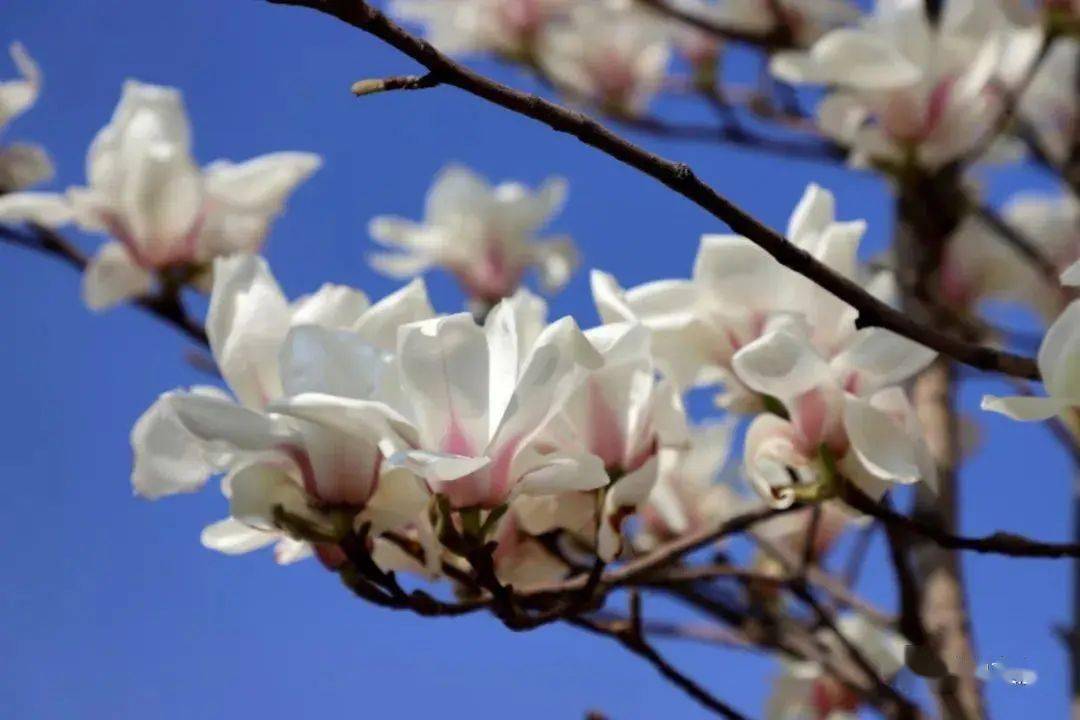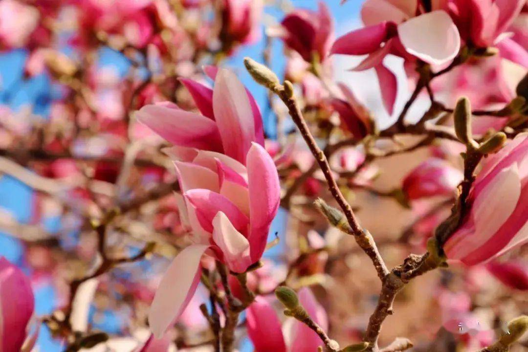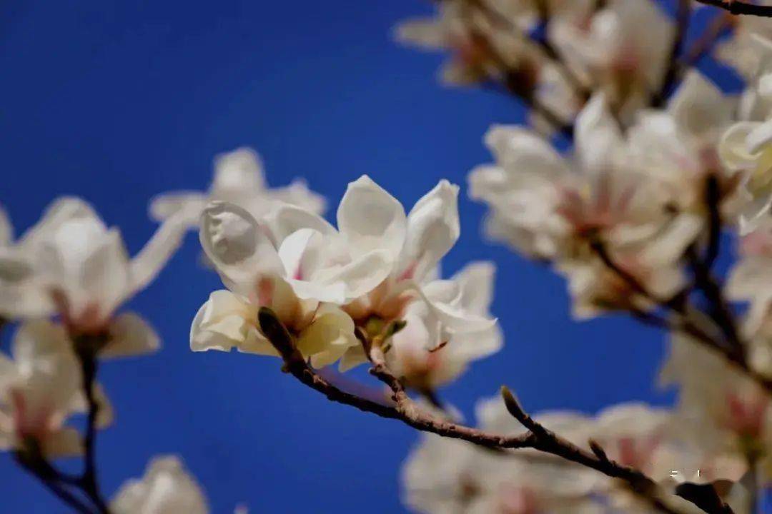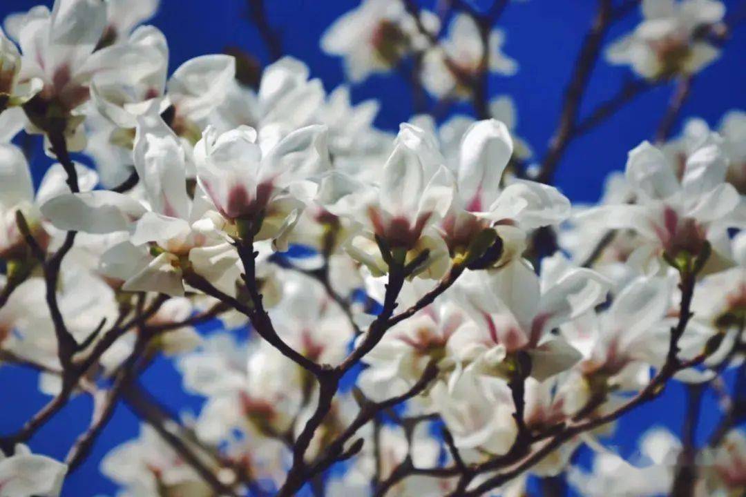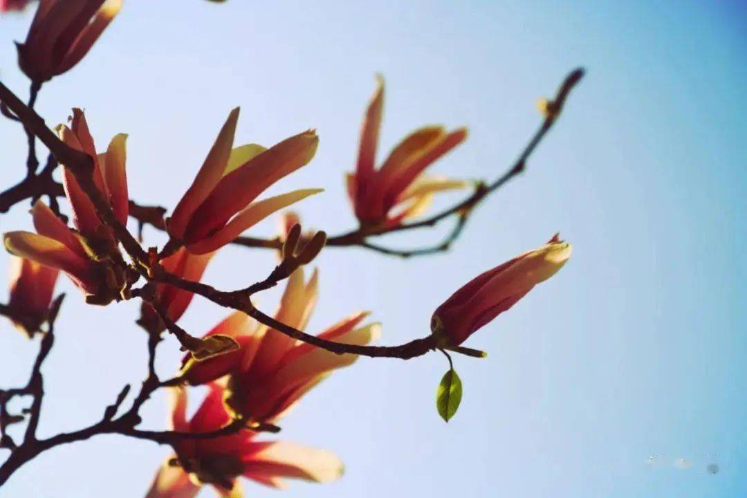 满枝无叶只芳华。玉兰花带着春天的气息,散发阵阵的清香,与蓝天白云晴空万里相互映衬,宛如一幅醉人春日丹青。白白红红的芽苞在枝头,不惧春寒,应季绽放,白如羊脂玉,红堪春桃花,淡紫沁心脾,让人不知不觉沉静在玉兰花海之中。