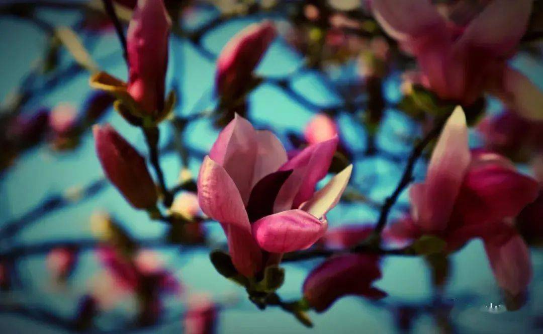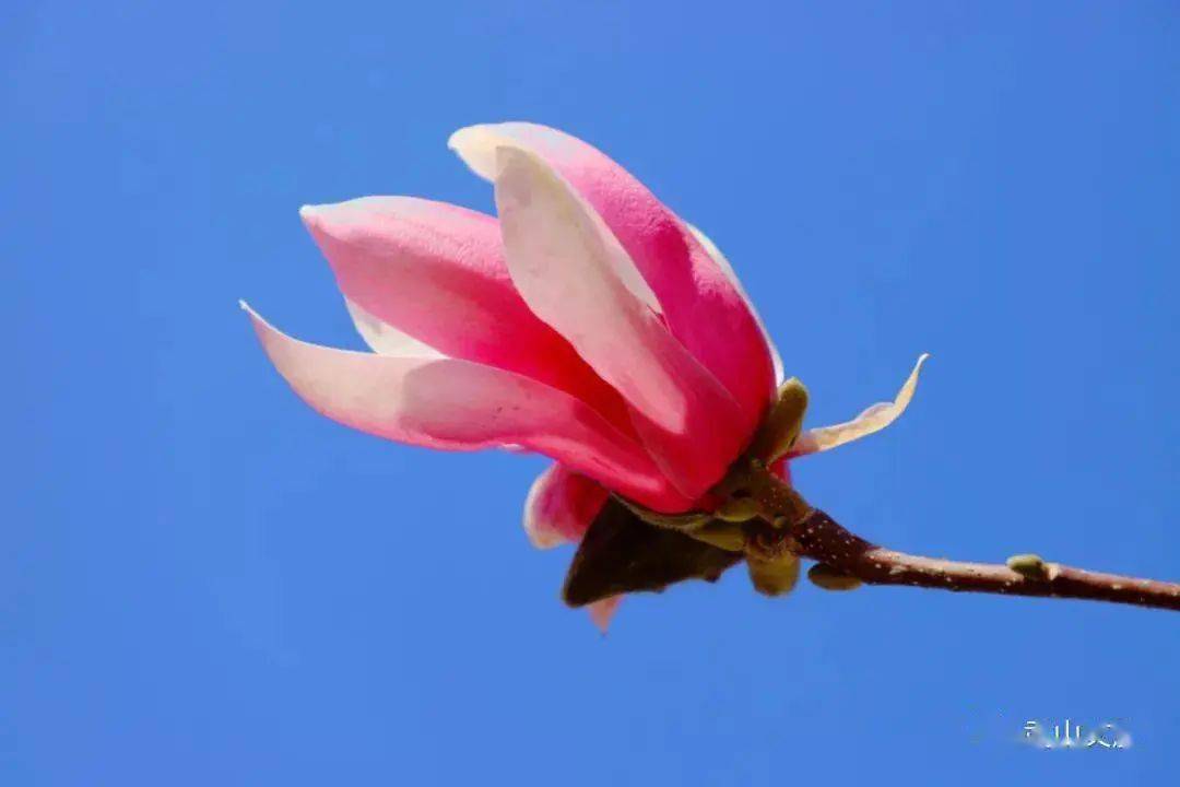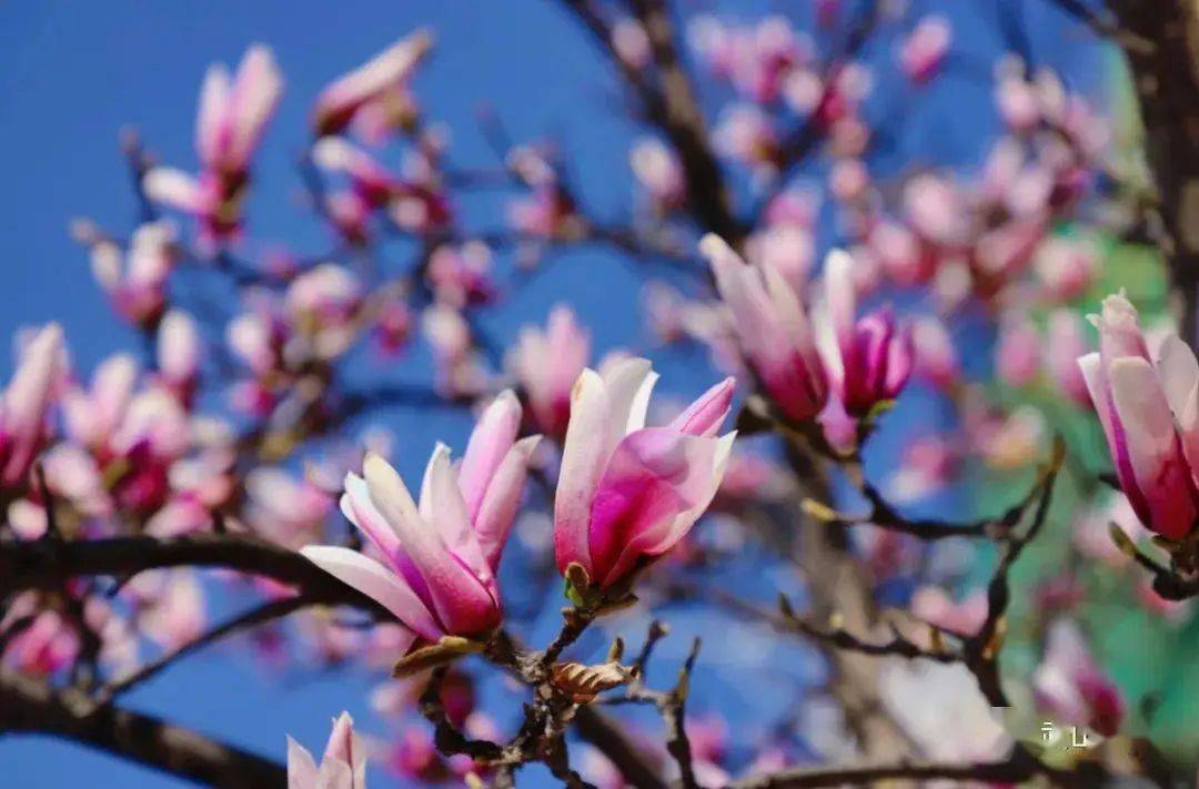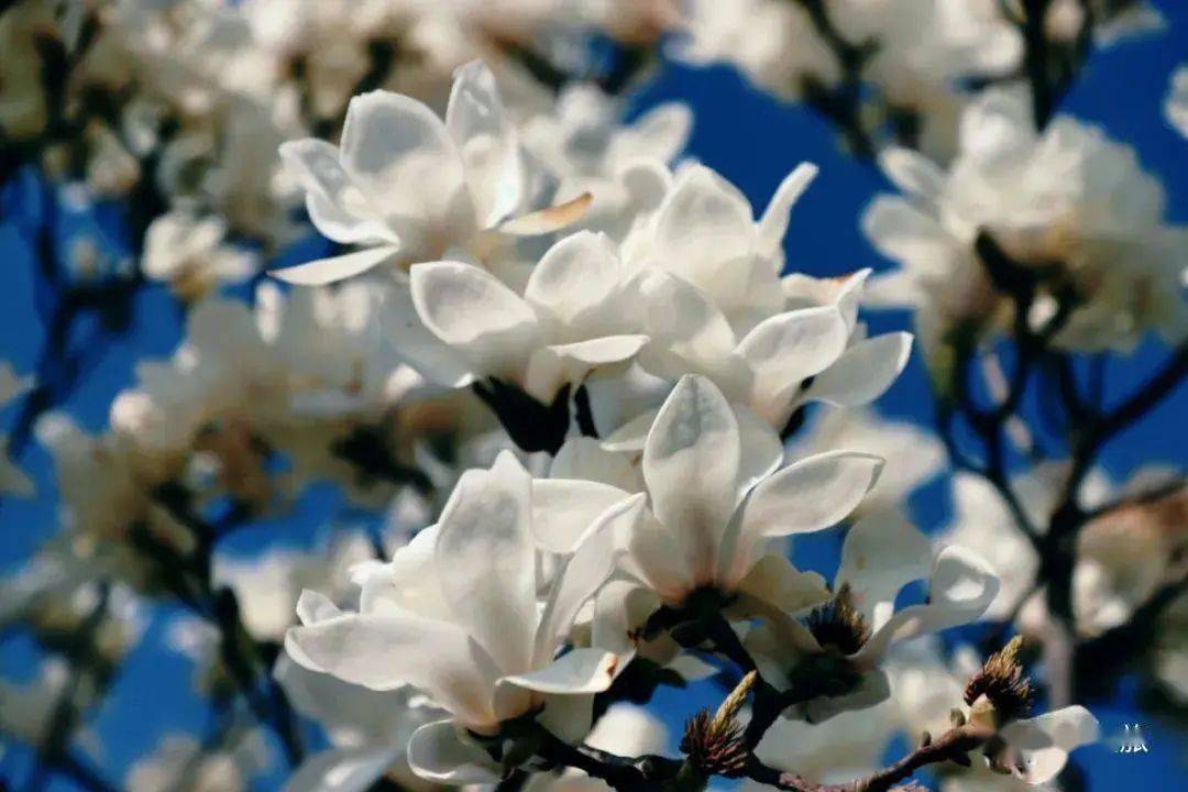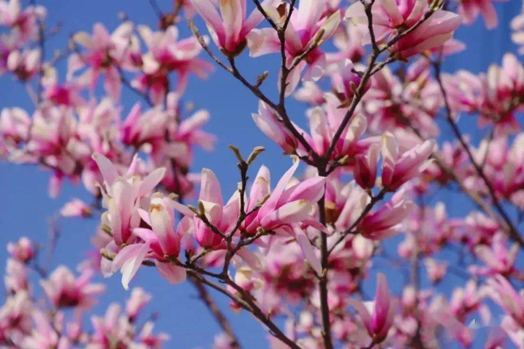 满枝无叶只芳华。玉兰花带着春天的气息,散发阵阵的清香,与蓝天白云晴空万里相互映衬,宛如一幅醉人春日丹青。白白红红的芽苞在枝头,不惧春寒,应季绽放,白如羊脂玉,红堪春桃花,淡紫沁心脾,让人不知不觉沉静在玉兰花海之中。