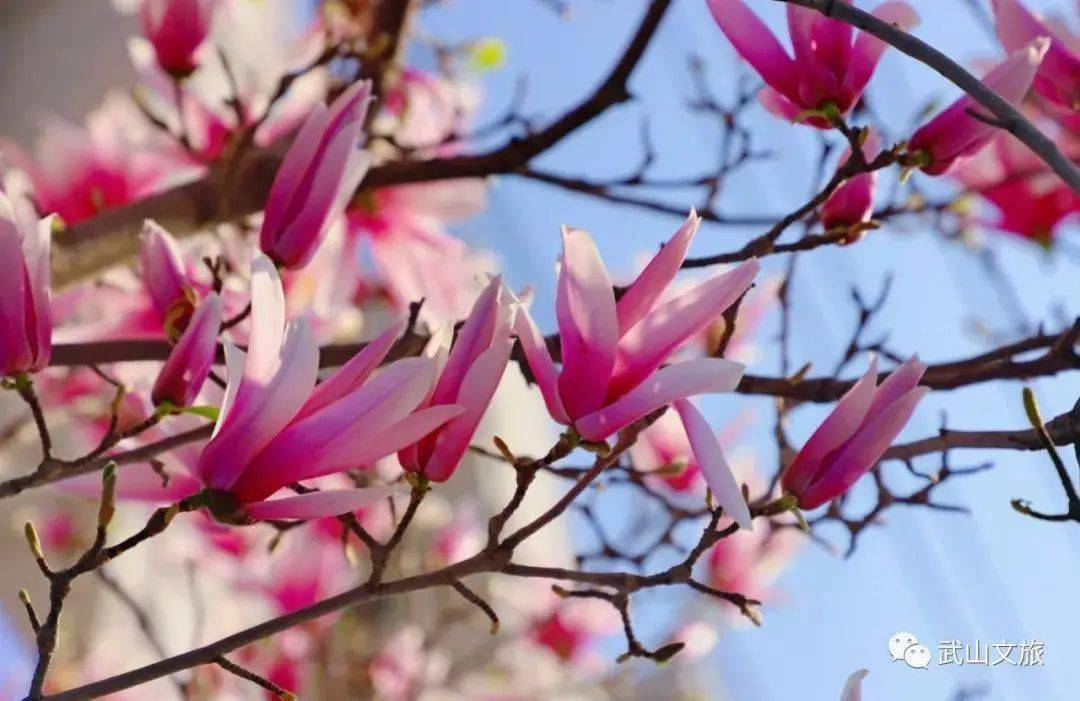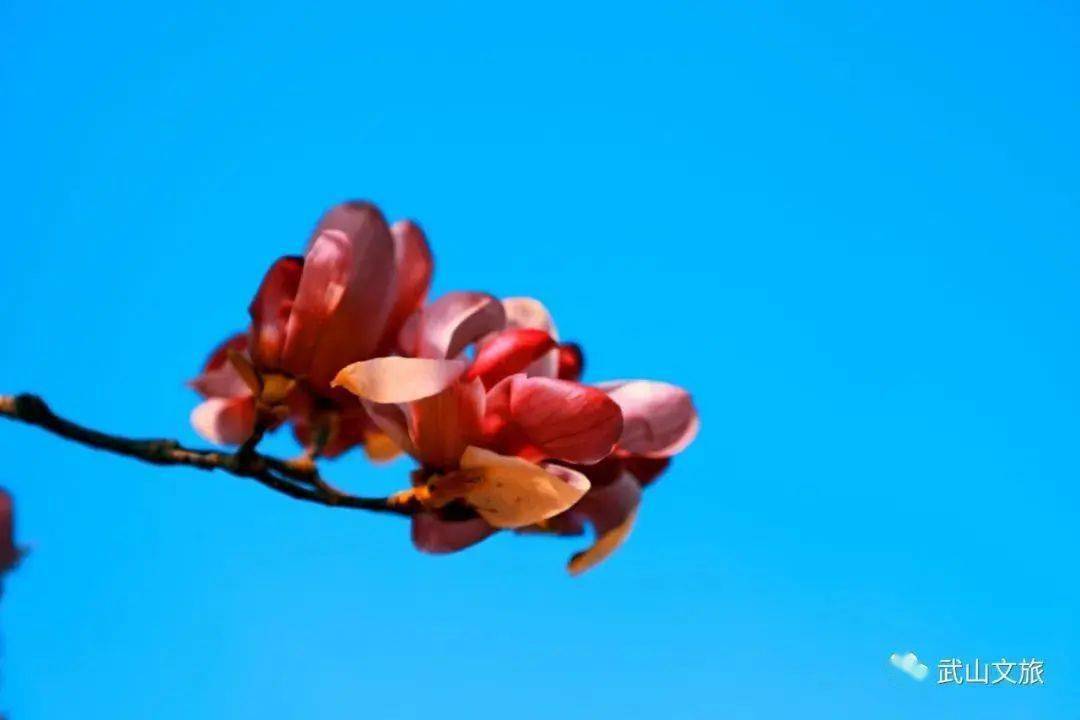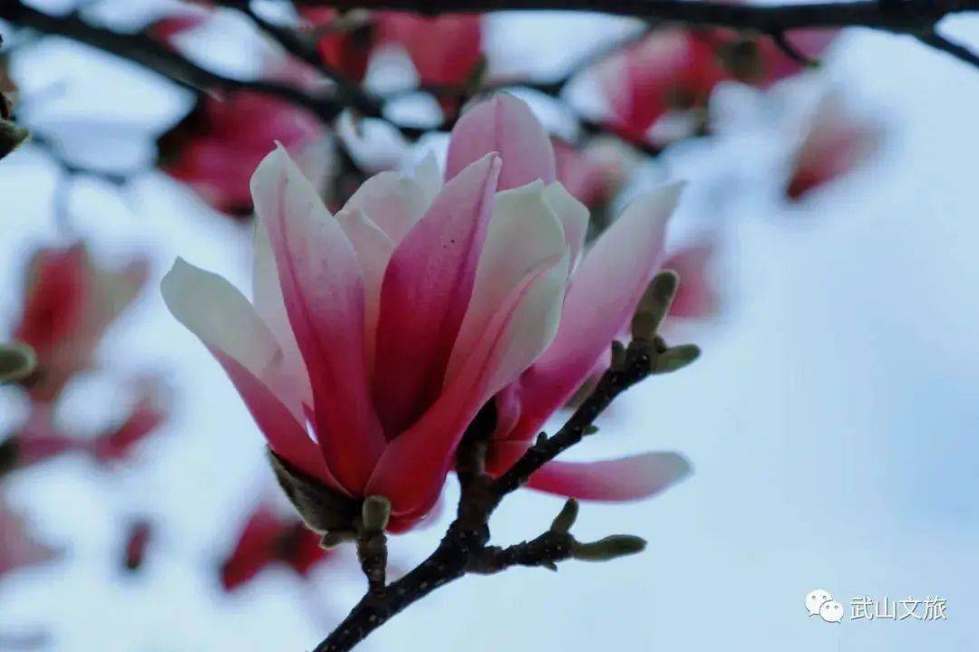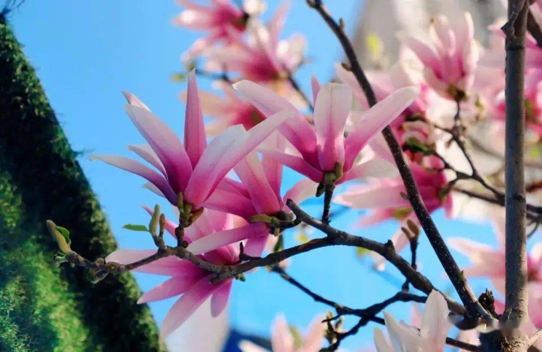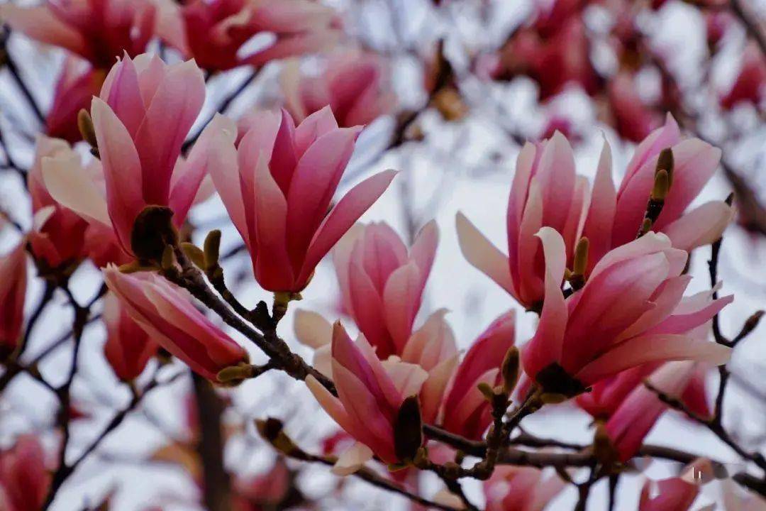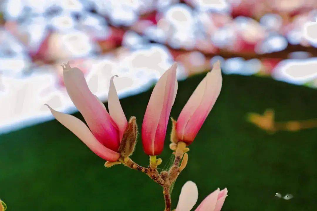 满枝无叶只芳华。玉兰花带着春天的气息,散发阵阵的清香,与蓝天白云晴空万里相互映衬,宛如一幅醉人春日丹青。白白红红的芽苞在枝头,不惧春寒,应季绽放,白如羊脂玉,红堪春桃花,淡紫沁心脾,让人不知不觉沉静在玉兰花海之中。