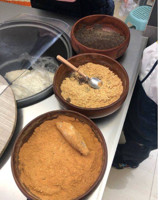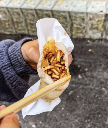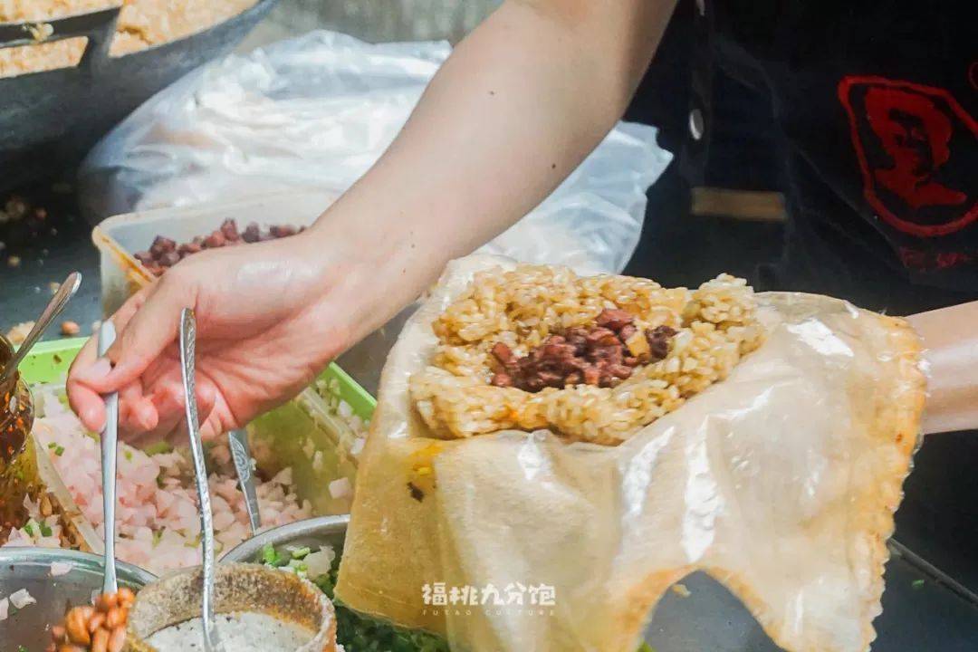 只见阿姨将一块塑料棉布摊在手掌,然后用小碗挖出一团拳头大小的糯米饭,中间捏扁,放入酸萝卜、葱花、花生米,再来一勺白糖、一勺油辣椒——甜咸之争在这里根本不算什么,要甜加糖、要咸加油辣椒。当然,你也可以像饱妹一样,做出成年人的选择——我全都要。